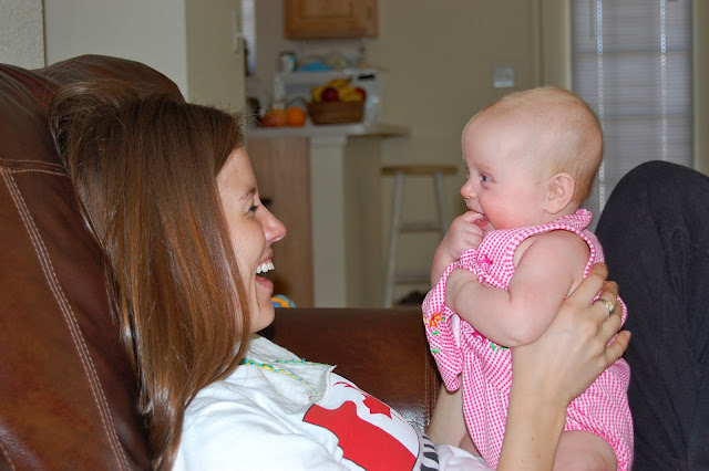 Left: Avery intently watching something...probably a Mavs game :) Right: We went in to get the babies one morning only to find Avery had rolled over! I figured she was close to it so we had slowly started to wean the babies off their swaddles (which is the reason why they are both "swaddled" with their arms out! We started with one arm out then both...)