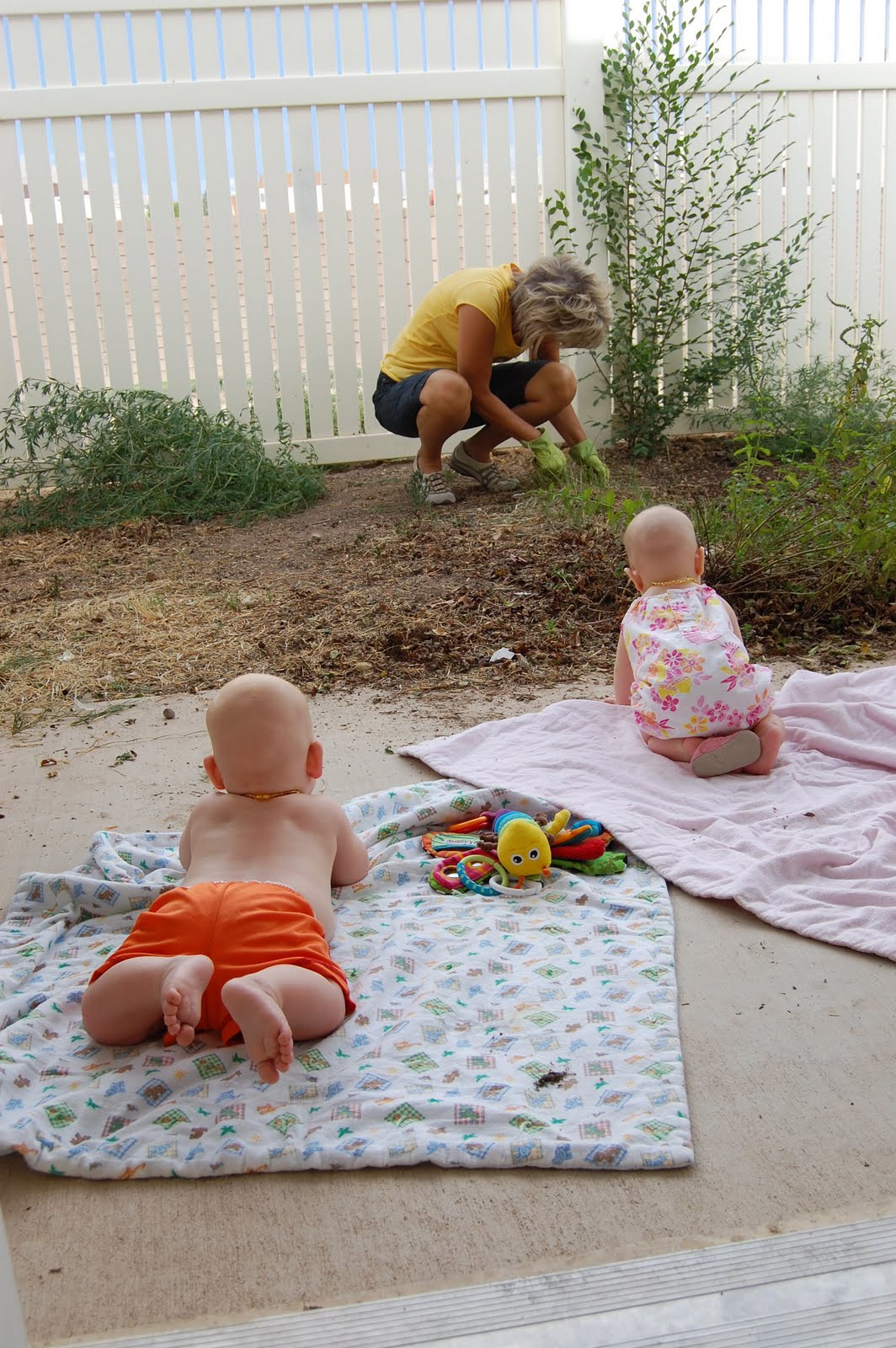 Left: Aksil isn't so sure about that eggs Daddy just let him try! Right: Mom making awesome progress on clearing out the back yard! The babies loved watching.